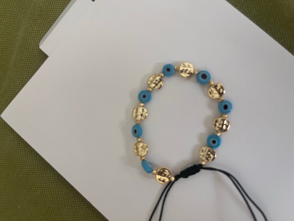 Turkuaz boncuklar ve altın renkli yılan desenli figürler içeren bohem tarzda bileklik, günlük kullanıma uygun minimal bir dokunuş sunar.