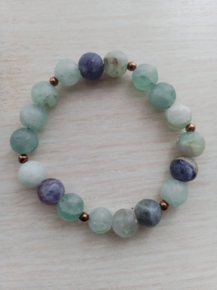 Pastel tonlarda turkuaz ve mor boncuklarla, küçük bakır detaylı bohem tarzı bileklik, günlük kullanıma uygun.