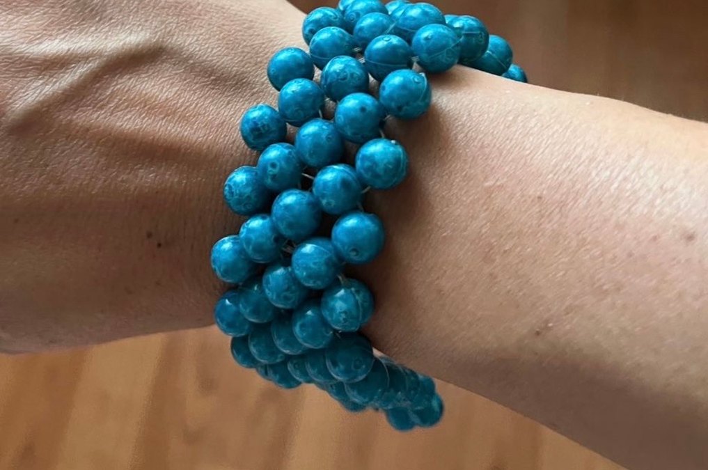 Parlak turkuaz renkte, boncuklu ve yılan desenli çoklu iplik bohem tarzı bileklik. Parti için uygun şık bir aksesuar.