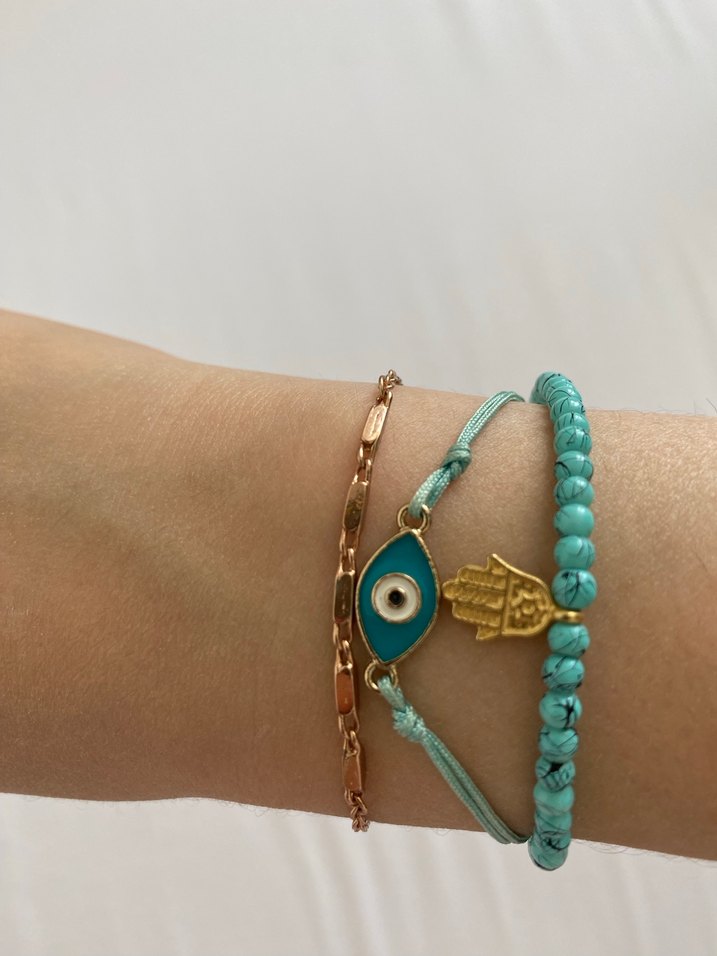 Turkuaz boncuklar ve yılan desenli detaylar içeren bohem tarzda bileklik seti, şans sembollü kolye ucu ile günlük kullanıma uygundur.