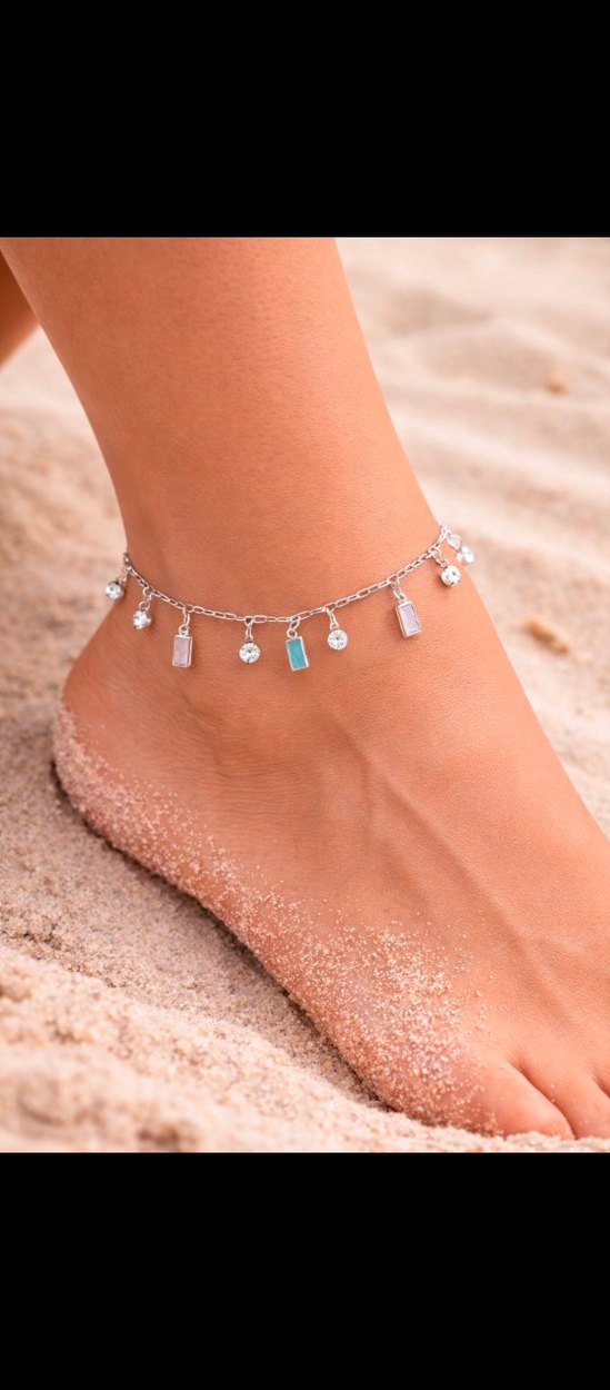 Pastel turkuaz boncuklar ve küçük gümüş süslemelerle bohem tarzda halhal. İnce zinciriyle plajda kullanıma uygun, retro ve hippie havası verir.