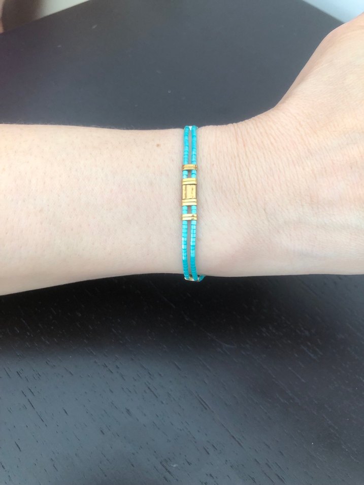 Turkuaz boncuklu, altın detaylı minimalist bohem tarzda kadın bileklik, günlük kullanıma uygun.