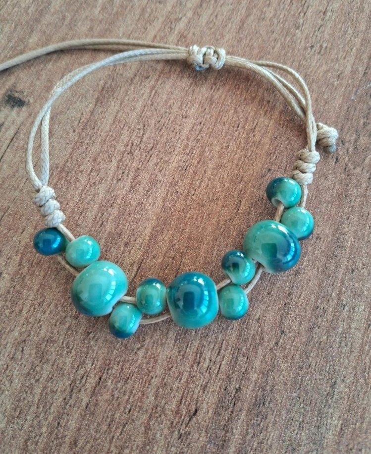 Ayarlanabilir ip üzerinde turkuaz boncuklarla bohem tarzda kadın bileklik, günlük kullanıma uygun.
