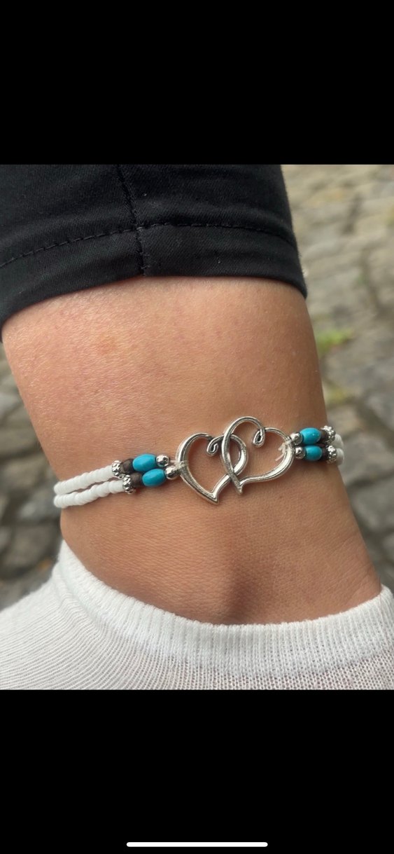 Turkuaz boncuklar ve gümüş çift kalp figürü ile bohem tarzda kadın halhal. Beyaz ve turkuaz boncuklar günlük kullanım için uygun.