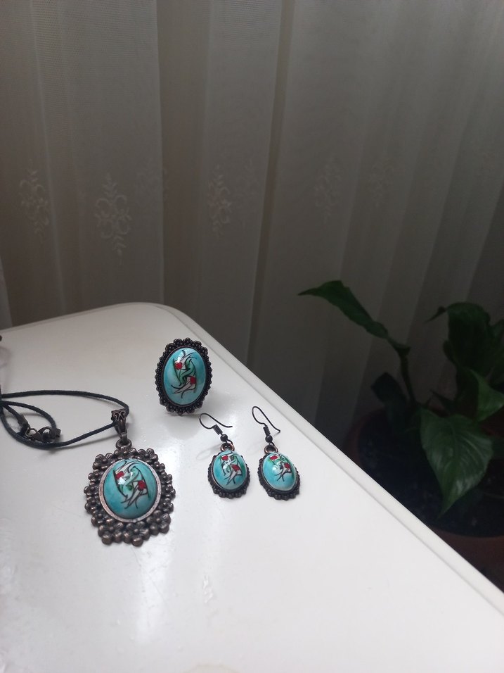 Turkuaz boncuklu ve etnik desenli kadın takı seti, renkli bohem tarzını yansıtır. Küpe, yüzük ve kolyeden oluşan vintage detaylı set günlük kullanım için uygundur.