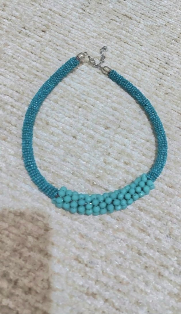 Turkuaz renkte, küçük boncuklardan oluşan bohem tarzda kadın kolyesi. Minimalist ve renkli tasarımıyla günlük kullanım için uygundur.