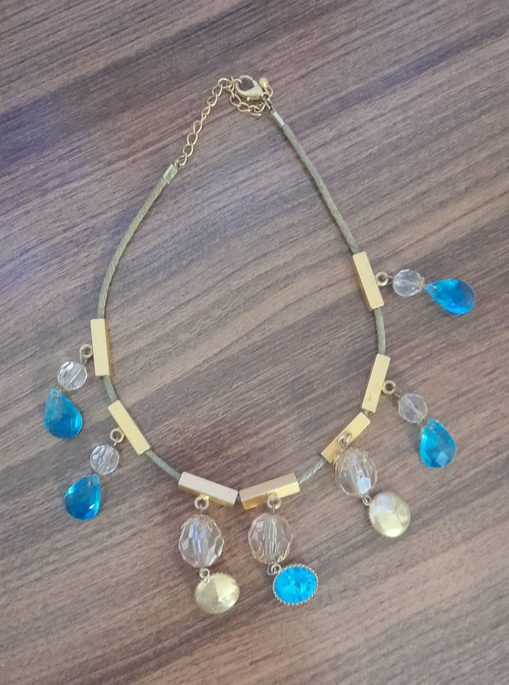 Turkuaz ve şeffaf boncuklar ile kısa bohem tarzda kolye, altın rengi detaylar ve batik desen esintili. Günlük kullanım için uygun.