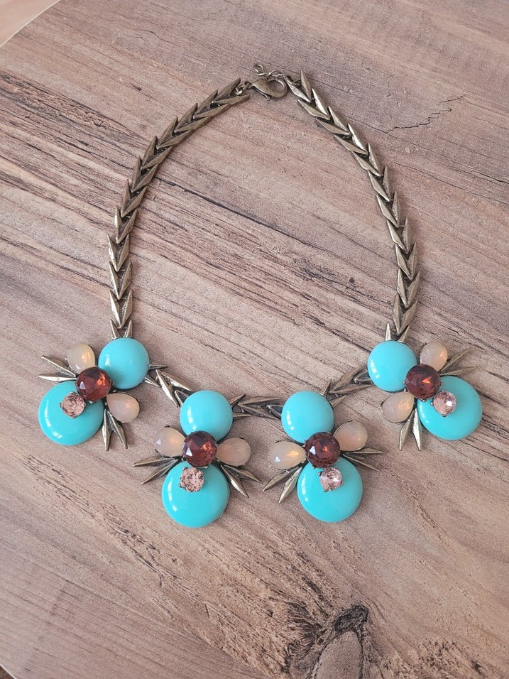 Uzun boylu, turkuaz boncuklardan oluşan bohem kolye, pastel renkli çiçek desenleriyle romantik akşamlar için uygundur.