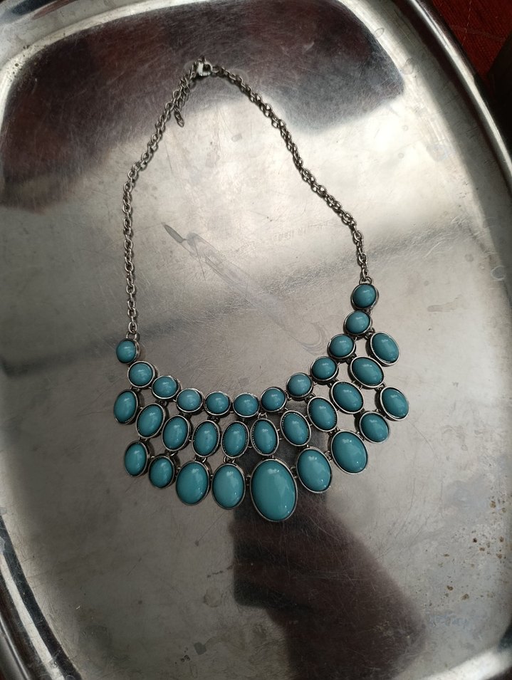 Bu bohem tarz kolye, turkuaz boncuklarla süslenmiş Normal uzunluğunda, gümüş zincirli ve günlük kullanıma uygundur.