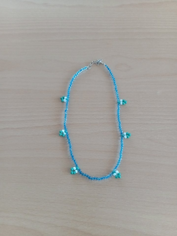 Turkuaz boncuklardan oluşan, bağlama desenli, minimalist bohem tarzda günlük kullanıma uygun midi uzunlukta kolye.