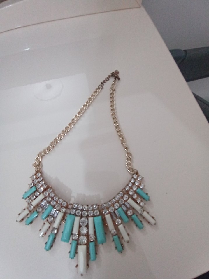 Turkuaz boncuklar ve parlak taşlarla süslenmiş, altın renk zincirli bohem midi kolye, günlük kullanım için uygun.