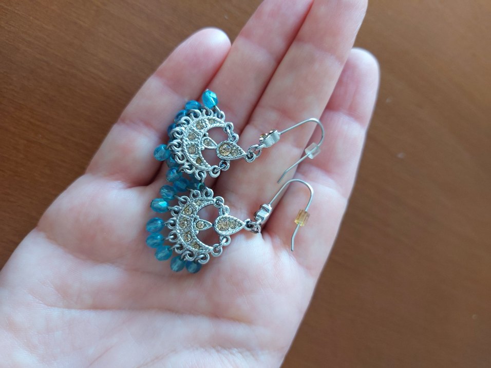 Turkuaz boncuklar ve işlemeli desenler taşıyan bohem tarzda, midi uzunlukta, renkli ve retro görünümlü küpeler. Düğünlere uygun. accessorizedan alındı