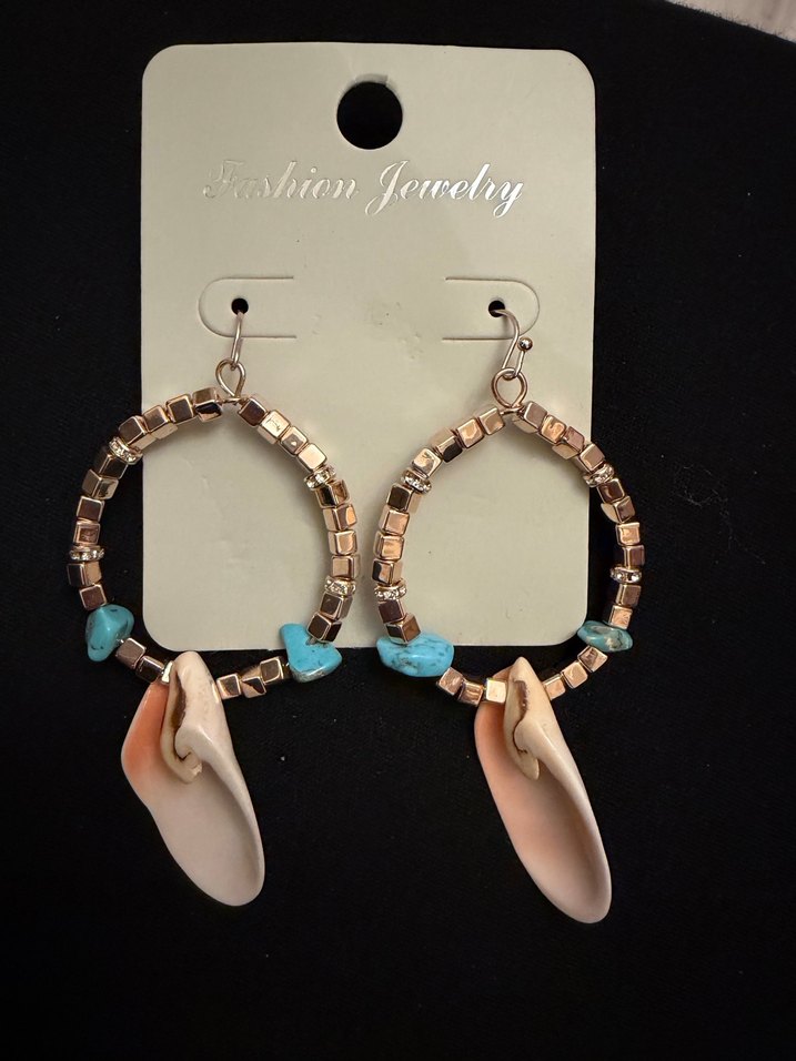 Turkuaz boncuklu, kısa boyda, baskılı kabuk detaylı bohem tarzda küpelerdir. Plaj için uygundur.