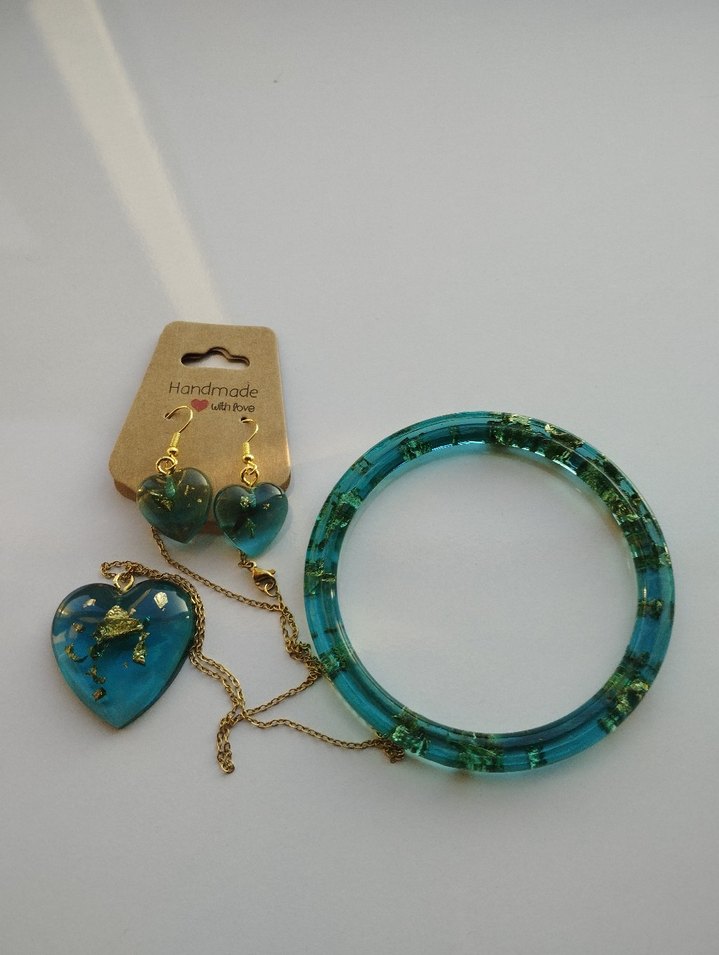 El yapımı bohem takı seti, turkuaz tonlarda renkli boncuklu küpeler, kalp kolye ve yılan desenli bileklik içerir. Epoksi döküm olup nicerisinde altın yaldız mevcuttur
