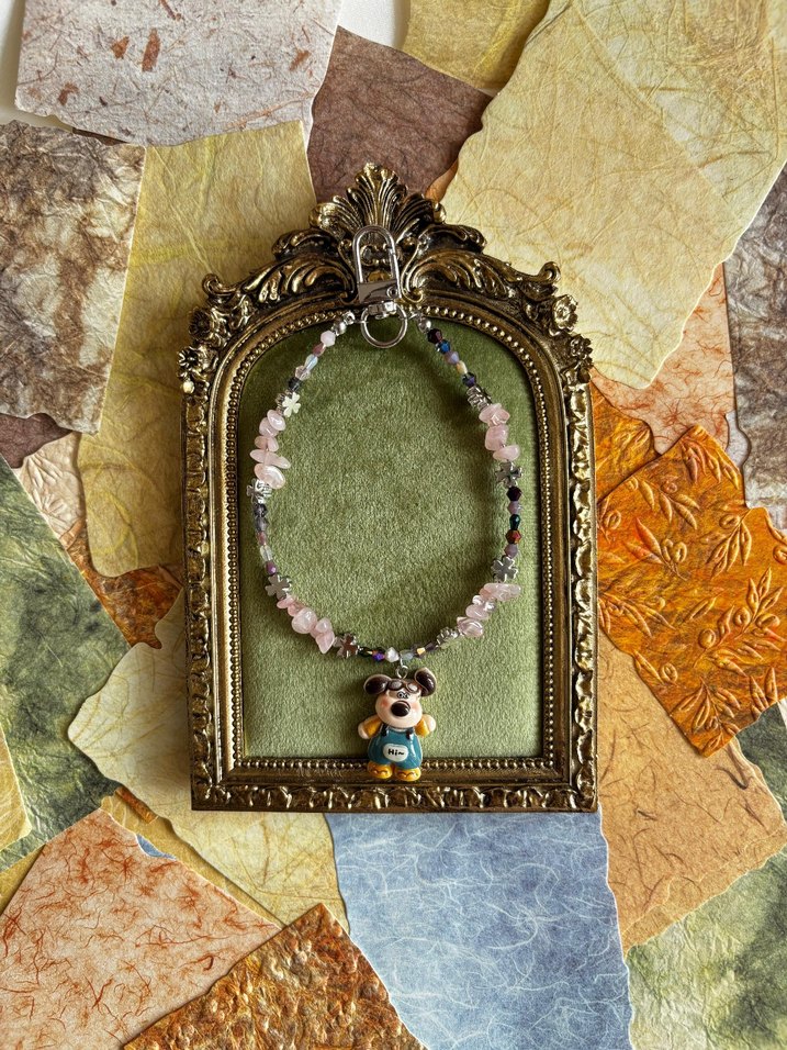 Turkuaz tonlarda pastel boncuklar ve nakış desenli, bohem tarzda vintage charm Romantik akşamlar için oyuncu bir kolye ucu bulunur.