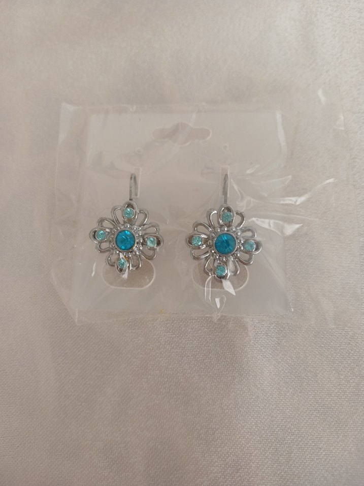 Turkuaz renkli, boncuklu çiçek desenli kısa uzunlukta mini küpeler, bohem tarzına uygun.