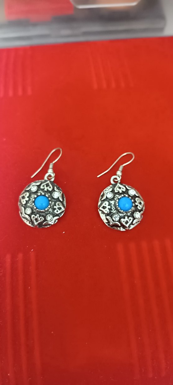 Etnik desenli gümüş tonlu tabanın ortasında renkli turkuaz boncuk bulunan bohem tarzda midi küpeler, günlük kullanıma uygundur. yanında 2 adet yüzük te gönderilecektir