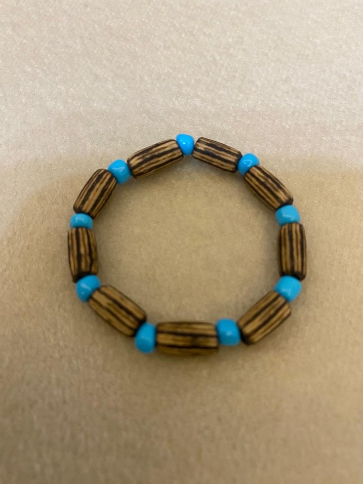 Turkuaz ve ahşap boncuklardan oluşan bohem tarzda renkli ve doğal görünümlü bileklik, günlük kullanım için uygundur.