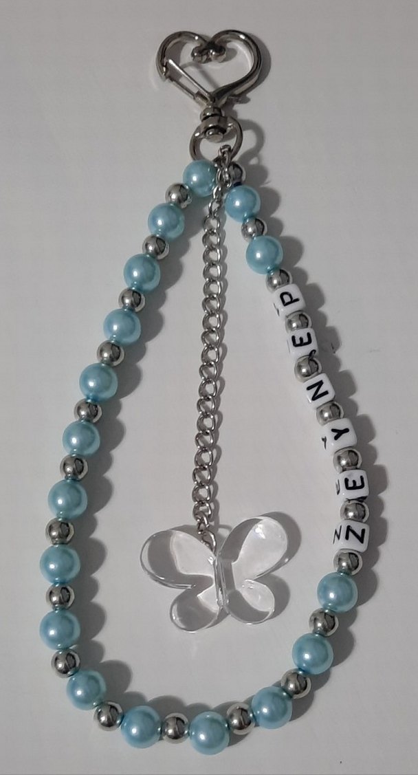 Turkuaz ve gri boncuklarla bezenmiş, şeffaf kelebek figürlü kadın charm. Minimalist ve bohem tarzları yansıtır. Günlük kullanım için uygundur.