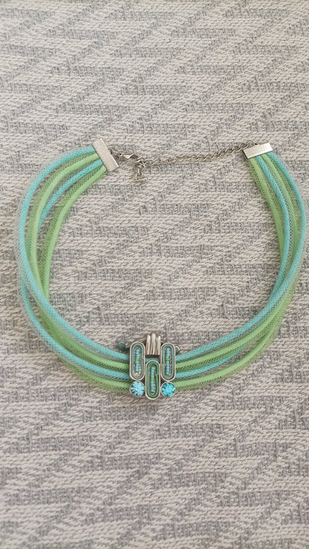 Pastel turkuaz ve yeşil boncuklu, nakış detaylı kısa bohem kolye. Günlük kullanıma uygun, mini uzunlukta.