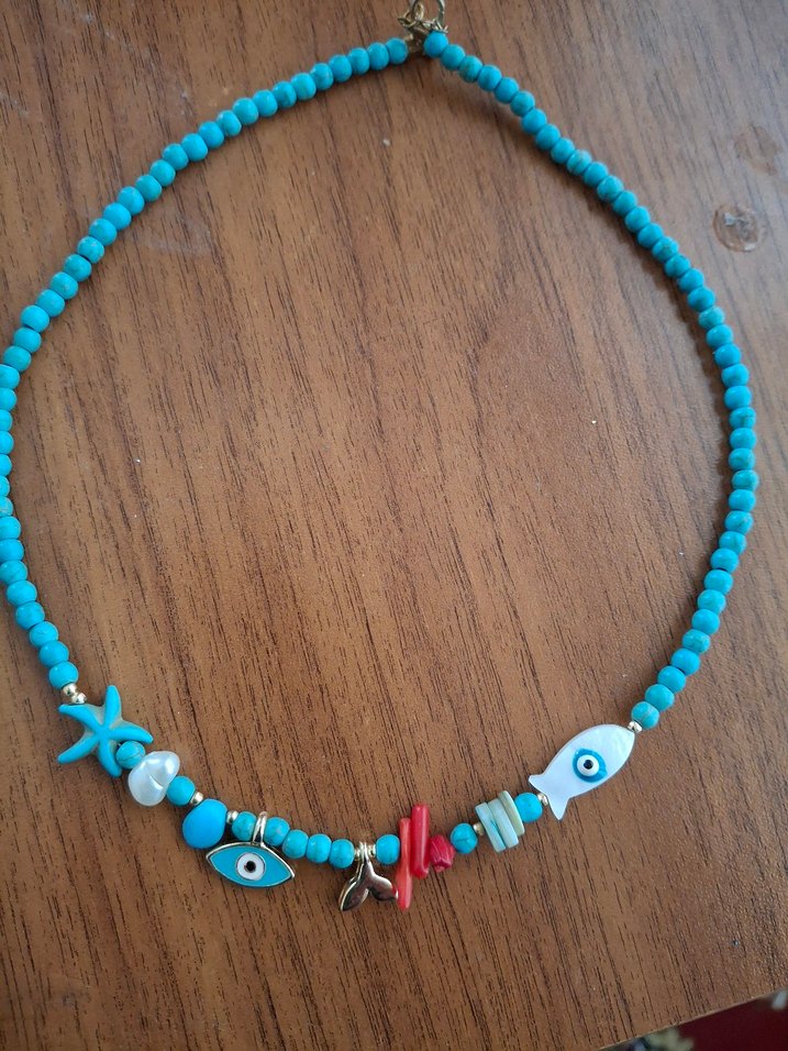 Turkuaz boncuklu, nakışlı ve renkli bohem figürlere sahip kısa kolye, günlük kullanım için uygun.