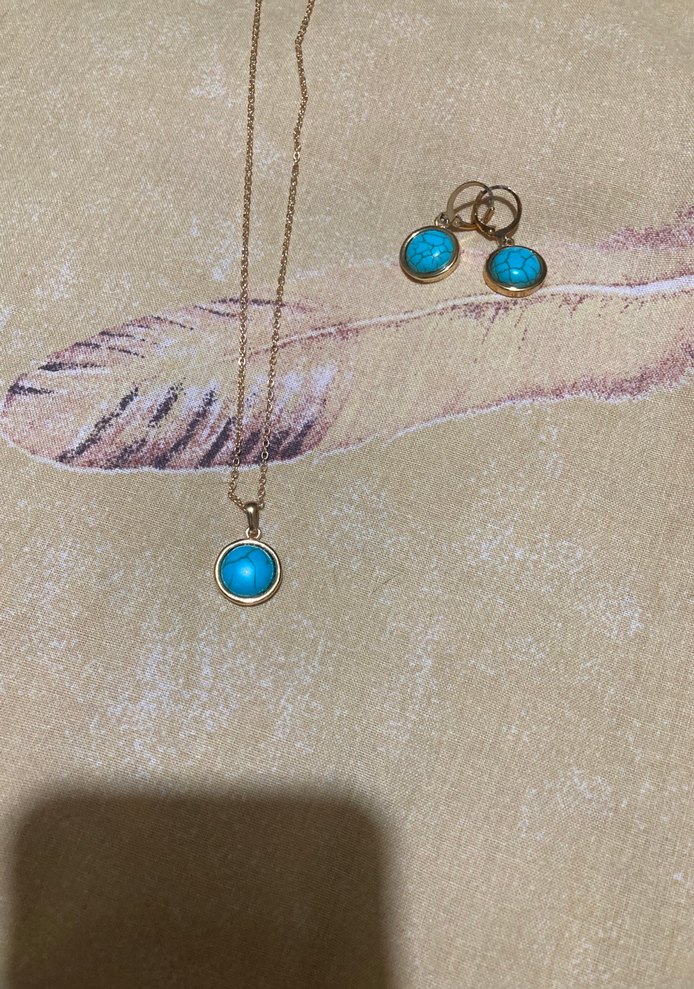Turkuaz boncuklu mini uzunlukta bohem tarzda kolye, günlük kullanıma uygun. Pastel tonlar ve batik deseni retro bir hava katıyor. Bir çift küpesiyle beraber