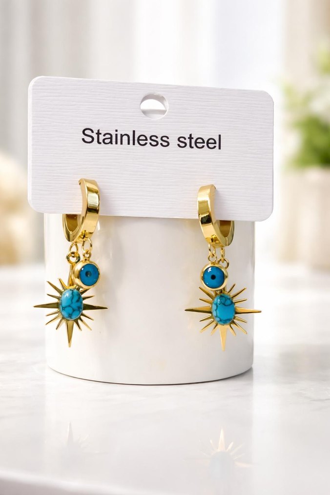 Paslanmaz çelikten kısa uzunlukta, turkuaz boncuklu ve güneş deseni detaylı altın tonlu küpe. Günlük bohem tarz için uygun.