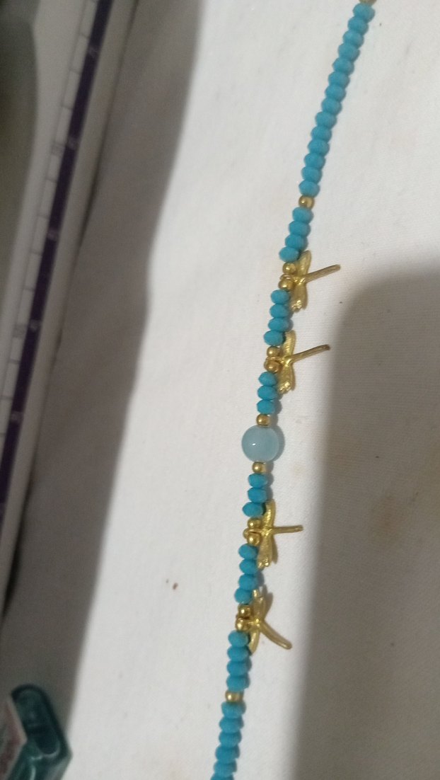 Turkuaz boncuklar ve altın renkli detaylarla uzun kadın kolyesi, bohem ve minimalist nakış desenine sahiptir. Günlük kullanım için uygundur.