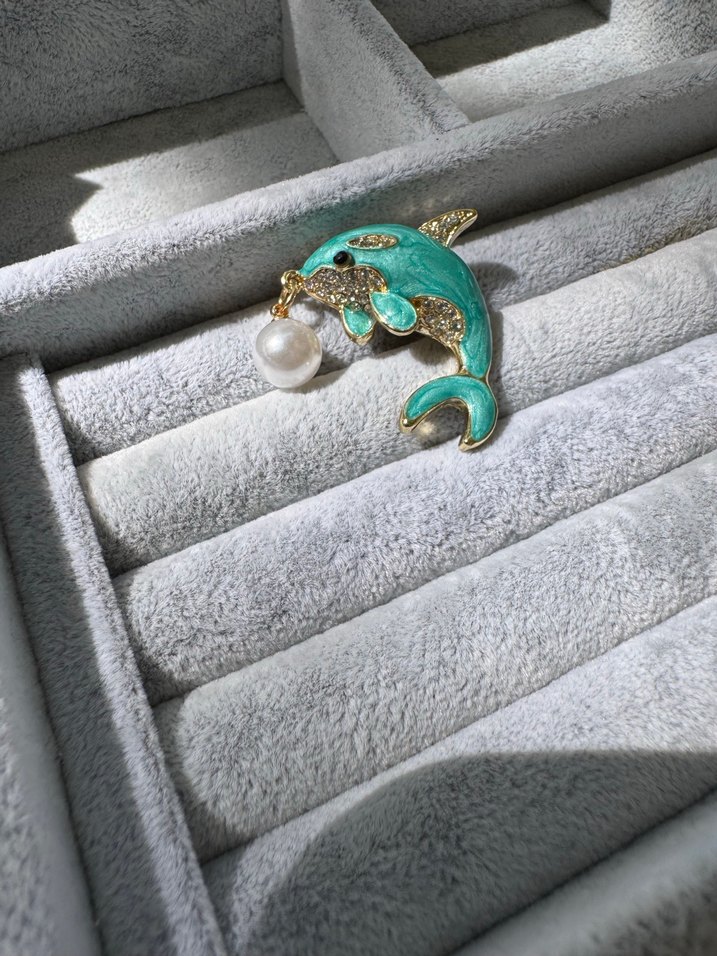 Parlak turkuaz renkte, boncuk detaylı ve inci süslemeli yunus başağını broş günlük klasik şıklığa uygun.