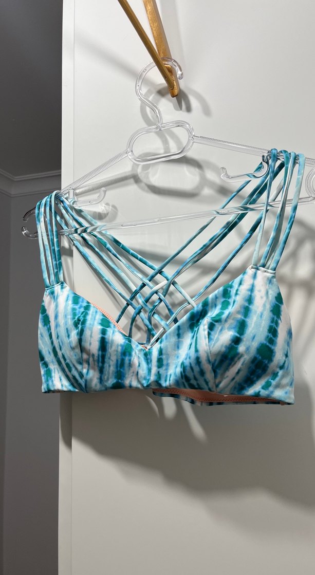 Turkuaz tie-dye deseni ve bağlama detaylı danteliyle bohem tarzda, vücuda oturan bikini üstü.