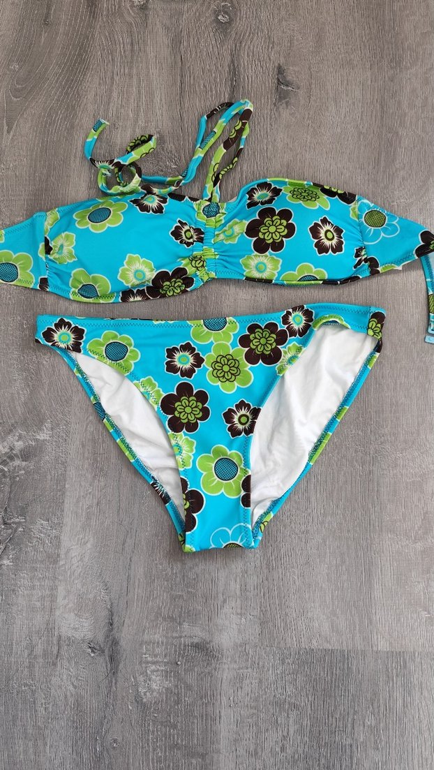 Turkuaz renkli, çiçek desenli bikini takımı hiç kullanılmamıştır. sorunsuzdur