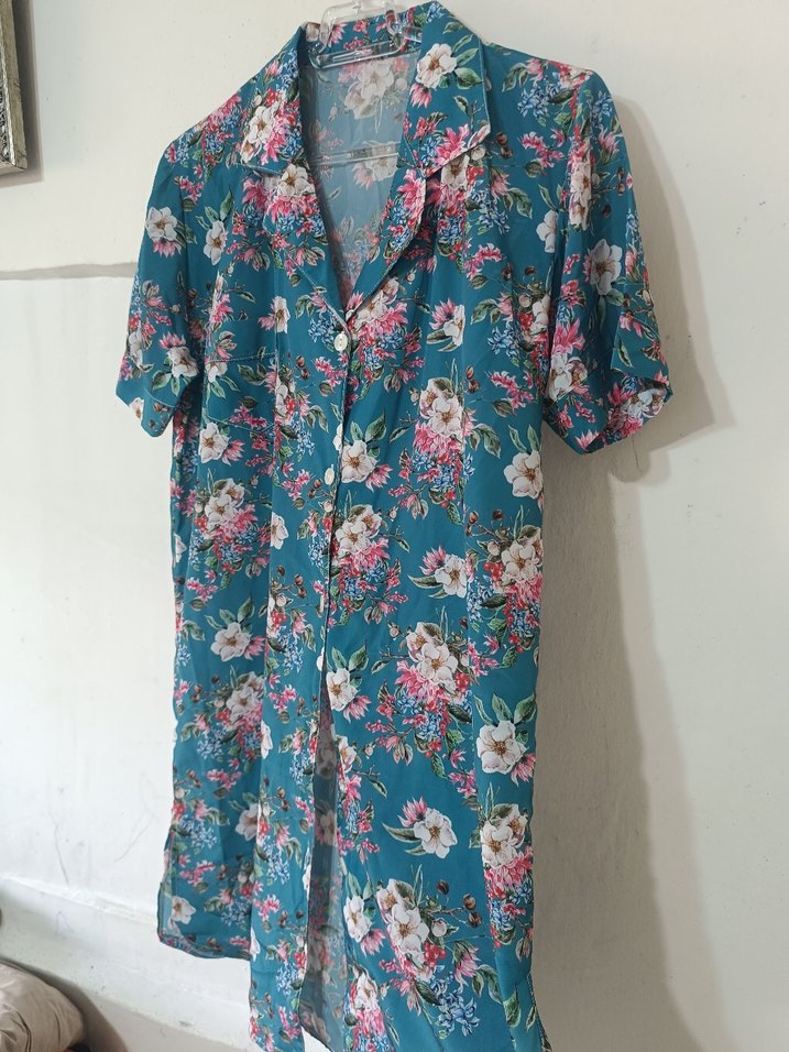 Turkuaz renkte, çiçek desenli, düğmeli ve V yakalı kısa kollu, bol kesim kadın bluzu. Sentetik kumaştan, bohem ve vintage tarzında.