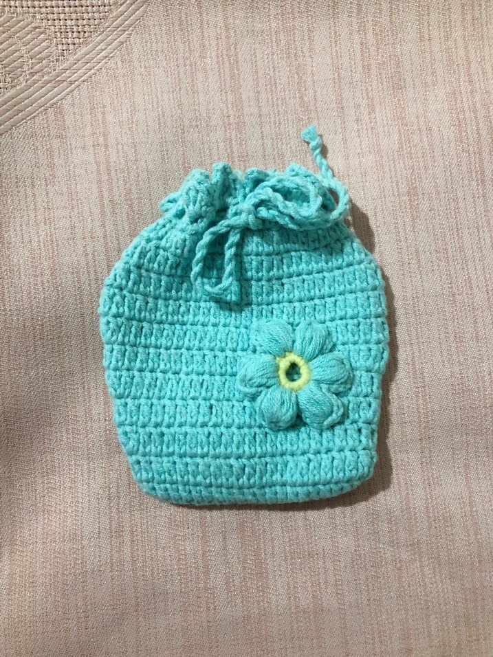 Turkuaz renkli, çiçek detaylı kese, kulaklık kılıfı.