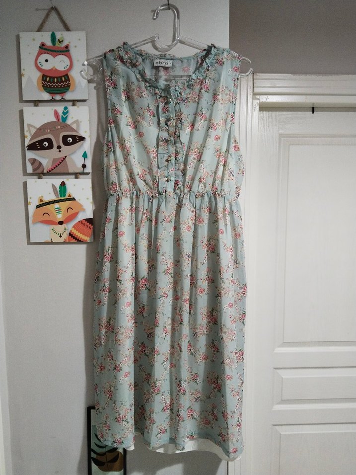Turkuaz renkte, straplez yaka ve fırfır detaylı, pamuklu kumaştan yapılmış, bol kesim midi elbise. Vintage çiçek desenli, bohem tarzda, kolsuz model.