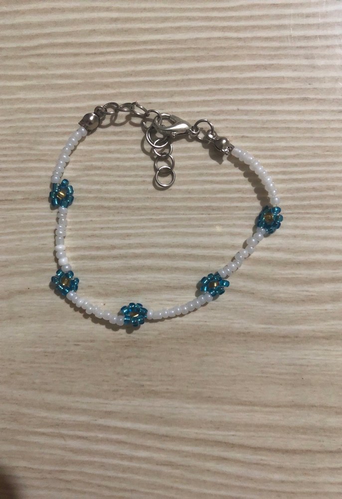Bu boncuklu kadın bileklik, açık turkuaz çiçek desenleriyle minimalist bohem tarzına uygundur. Günlük kullanım için zarif tasarıma sahiptir.