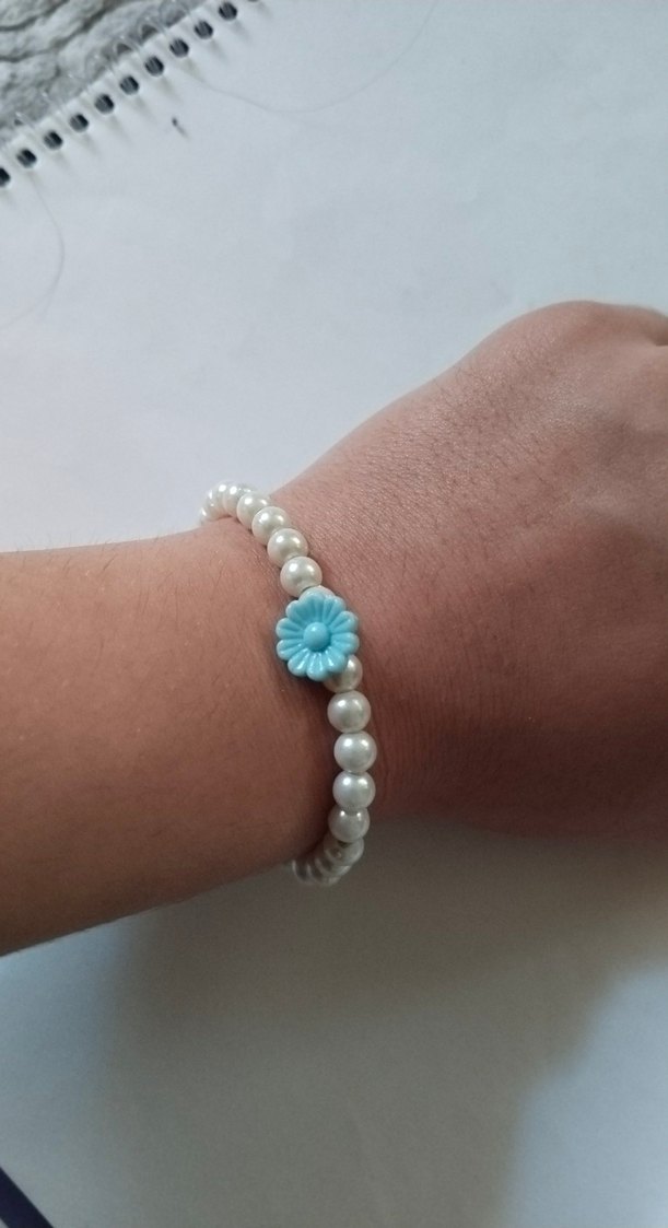 Pastel turkuaz çiçek detayı ve inci görünümlü boncuklardan oluşan, minimal bohem stilinde günlük kullanıma uygun bileklik.