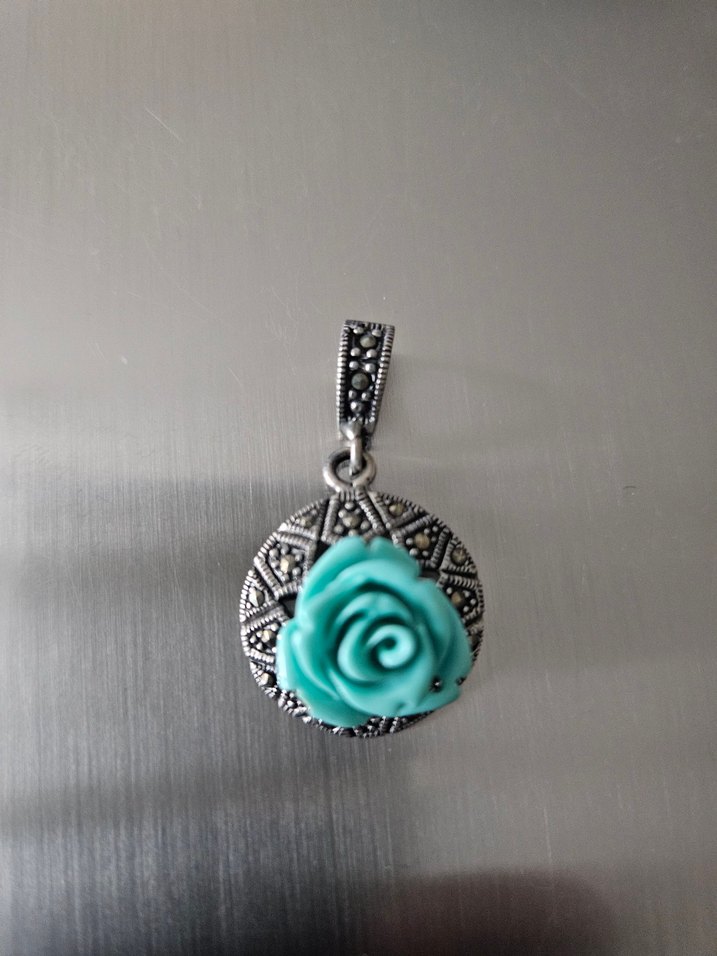 Turkuaz çiçek desenli, markazit detaylı vintage tarzda bayan kolye ucu, bohem tarz için uygun.