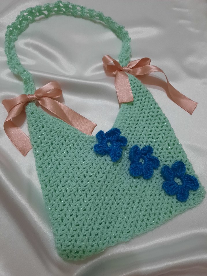 Pastel turkuaz renkte, mavi çiçek detaylı ve pembe kurdele süslemeli örgü kol çantasıdır. Yumuşak dokulu ve zarif bir görünüme sahiptir.
