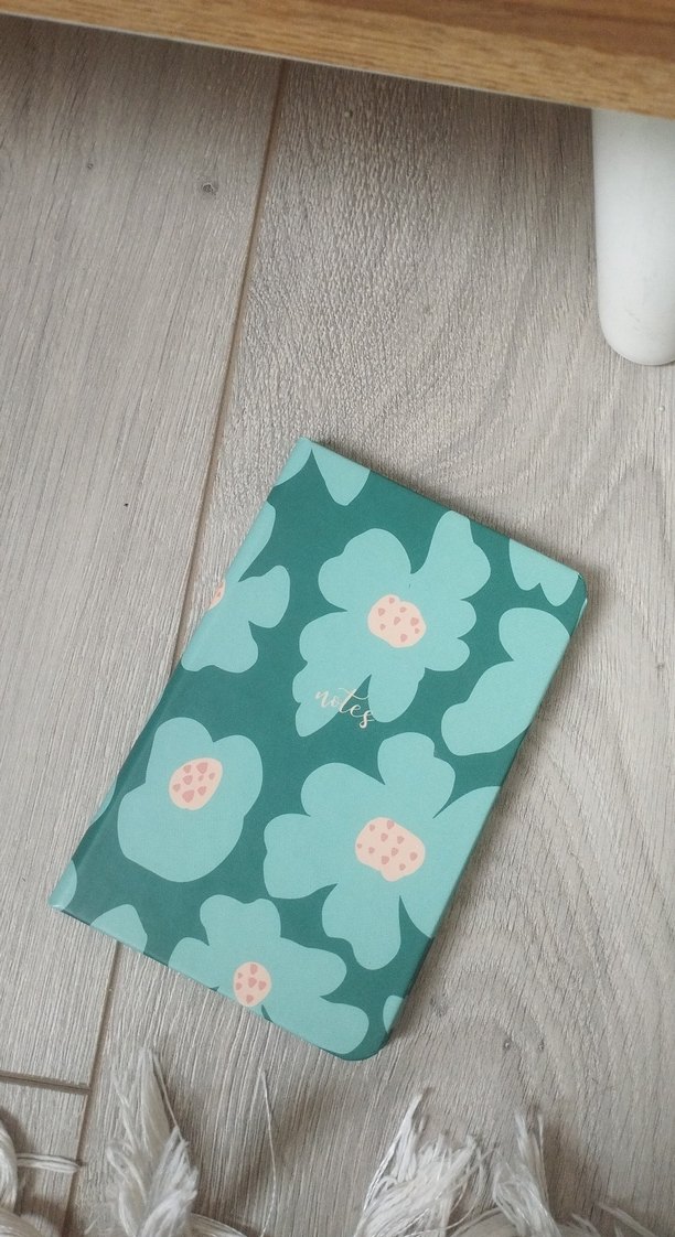 Turkuaz renkli, pastel çiçek desenli kapaklı yumuşak kapaklı defter. Notlarınızı almak için uygundur.