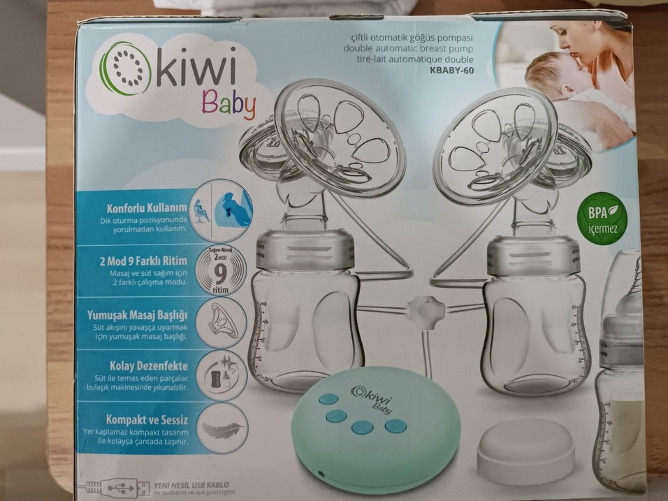 Turkuaz renkli Kiwi Baby çiftli otomatik göğüs pompası, sessiz çalışma ve ayarlanabilir ritim sunar. Yıkanabilir parçalar ve USB kablo dahildir.