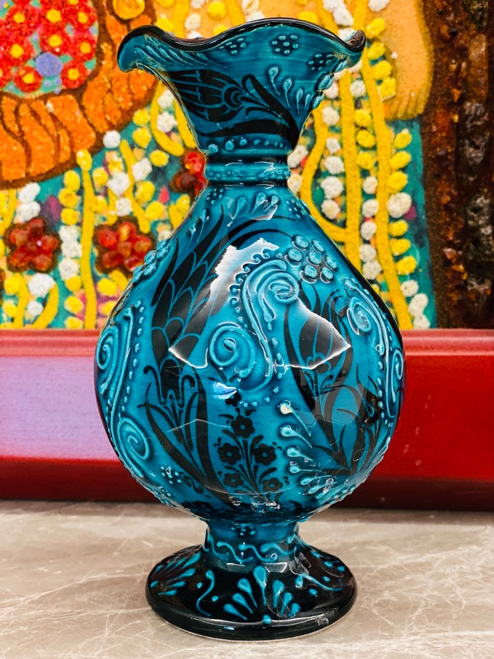 Turkuaz renkte, tamamen el işçiliği, desenli ve yuvarlak gövdeli dekoratif vazo, mekana canlılık katar. İADE YOKTUR #evdekoru #özelgünler #hediye #kütahya
