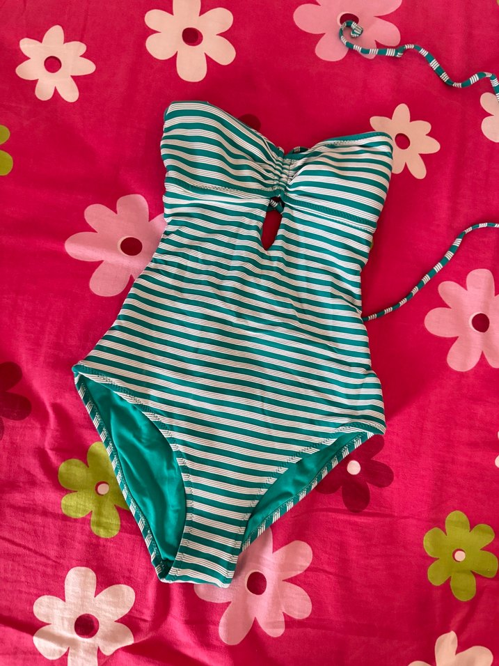 Tokalı ve ince askılı, turkuaz zebra çizgili, pop kültür retro tarzında, midi uzunlukta kadın mayo. Plaj için uygun, dikkat çekici tasarım. ️