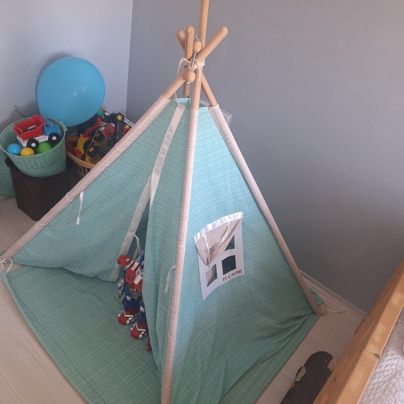 Ahşap direkli, küçük pencere detaylı pastel turkuaz çocuk oyun çadırı, iç mekan oyun alanları için uygun. ️