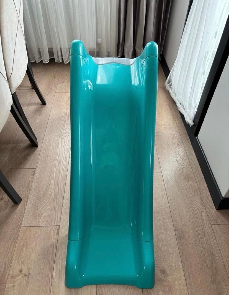 Koyu turkuaz renkte, dayanıklı ve pürüzsüz plastikten yapılmış çocuk kaydırağıdır. Güvenlik için yükseltilmiş yanlara sahiptir. Yerim olamadığı için satıyorum hiç bir kusuru yoktur