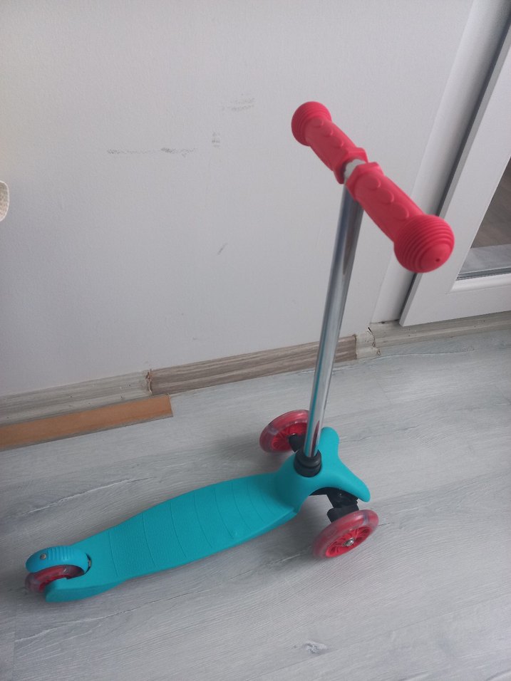 Turkuaz tabanlı, kırmızı renkli tutacak ve tekerleklerle renkli tasarıma sahip çocuk scooterı. Üç tekerlekli, sağlam yapılıdır.