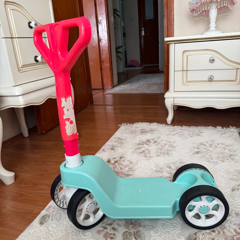 Renkli, turkuaz taban ve parlak pembe tutacaklı çocuk scooterı. Dört tekerlekli, dengeli ve rahat sürüş sağlar.