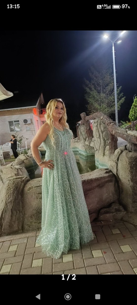 Turkuaz simli parlak cok guzel bi abiye 10.000 tl ye almistim 160 boy 83 kg ile .