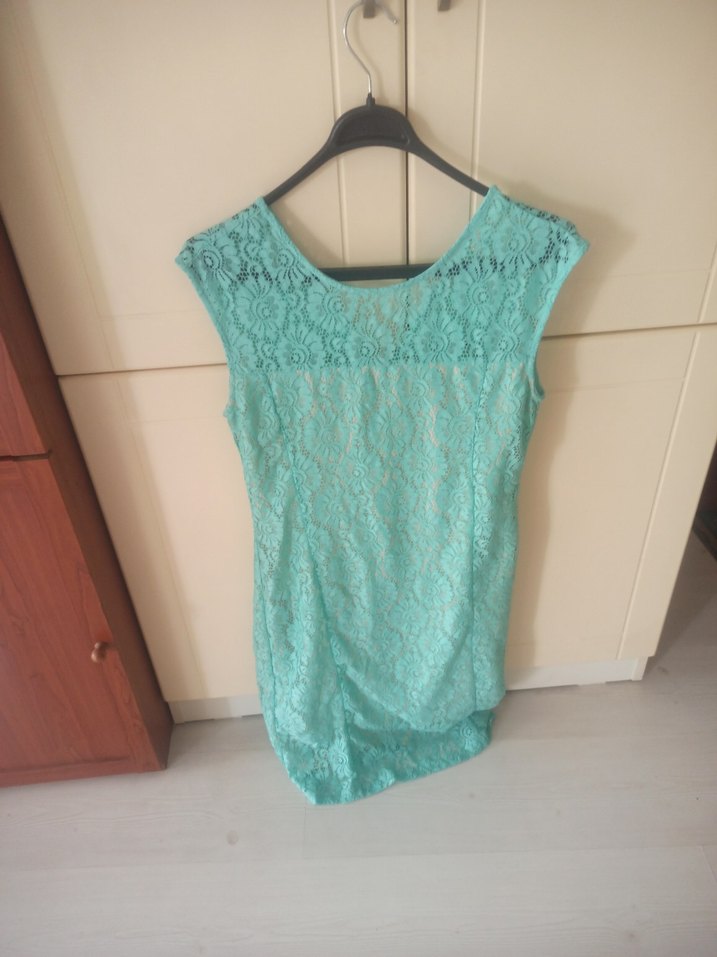 Turkuaz renkte, dantel detaylı, kolsuz elbise. Vücuda oturan kesimi ve yuvarlak yakasıyla günlük kullanım için uygun, yumuşak örme kumaştan.