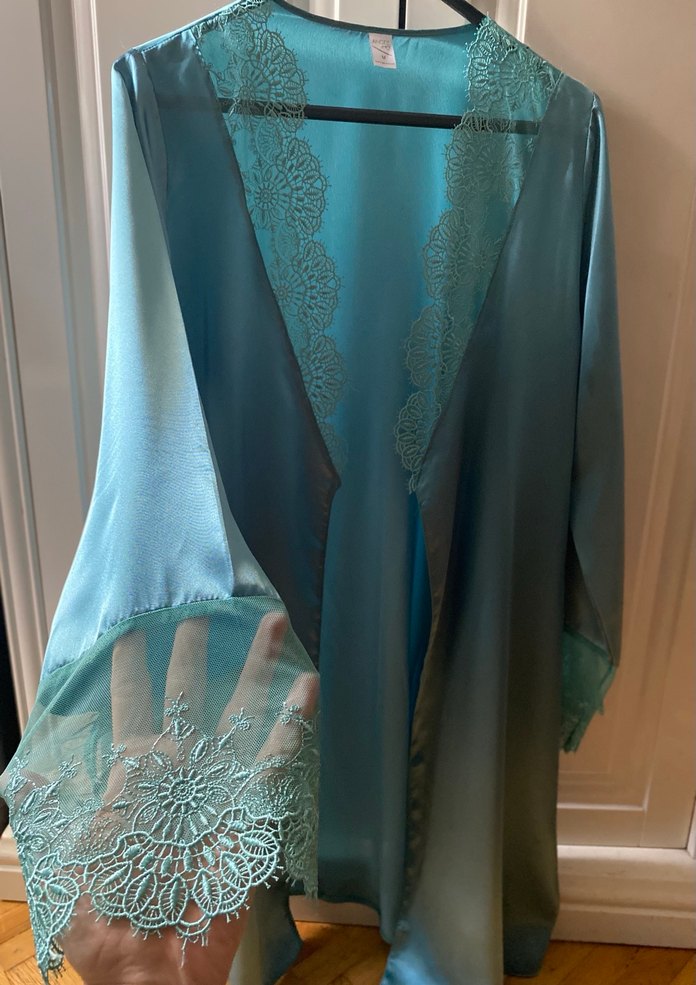 Uzun kollu, pamuk saten parlak turkuaz sabahlık. Yakası ve kolları dantel ve tül detaylı, üstün kalite ve yumuşacık ipeksi kumaşıyla. Kuşak ve geceliği yok. Tek ürün. İç etiketi mevcut.