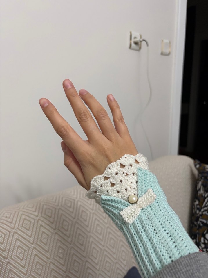 Turkuaz renkli triko eldivenler, beyaz dantel süslemeli ve inci detaylı küçük bir fiyonk içerir. Bohem ve retro tarzları bir araya getirir.
